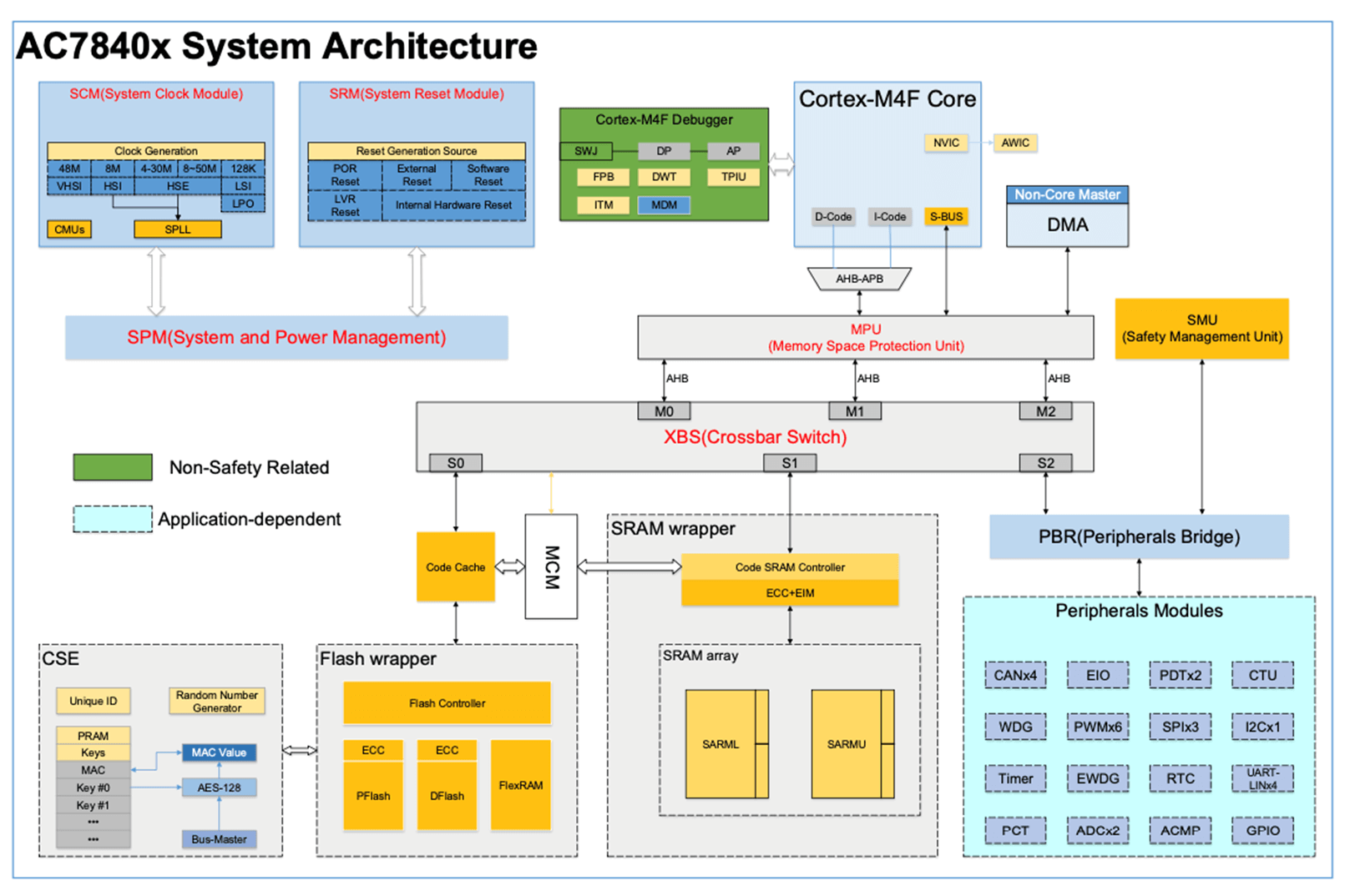 AC7840x是基于ARM Cortex-M4F內(nèi)核的車規(guī)級(jí)MCU,于2022年上市。產(chǎn)品符合AEC-Q100 Grade1, 功能安全符合ISO 26262 ASIL-B,信息安全符合SHE標(biāo)準(zhǔn),支持安全啟動(dòng)。軟件生態(tài)支持AUTOSAR MCAL4.4,可提供MCAL及配置工具。產(chǎn)品擁有雙Bank Flash用于存儲(chǔ)程序,支持OTA。AC7840x可廣泛應(yīng)用于汽車車身、座艙、車燈、新能源以及電機(jī)控制等應(yīng)用領(lǐng)域。