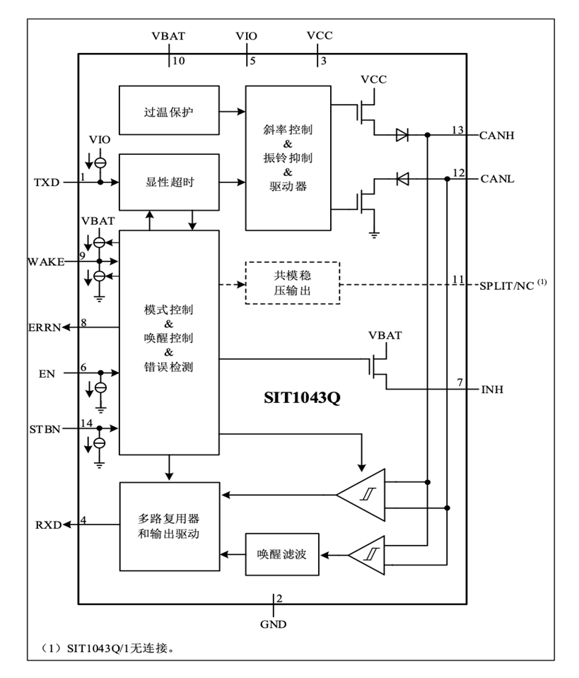 SIT1043QT是一款應(yīng)用于 CAN 協(xié)議控制器和物理總線之間的接口芯片,支持 5Mbps 靈活數(shù)據(jù)速 率(Flexible Data-Rate),具有在總線與CAN協(xié)議控制器之間進行差分信號傳輸?shù)哪芰?。SIT1043QT總線端口耐壓可達-58V 至+58V,接收器共模輸入電壓達到-30V 至+30V,適用于 12V 或 24V 應(yīng)用系統(tǒng)。 SIT1043QT 采用多電源供電,擁有多種系統(tǒng)保護和診斷功能以提高器件和 CAN 的穩(wěn)定性。另外, SIT1043QT擁有五種工作模式:正常工作模式、靜音模式、待機模式、睡眠等待模式和睡眠模式,在低 功耗模式下支持本地喚醒與遠程喚醒,所提供的低功耗模式管理可極大節(jié)省 CAN 總線應(yīng)用系統(tǒng)的電力 。
