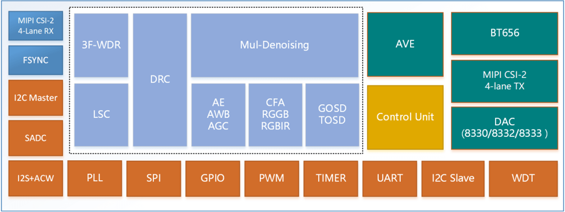 FH8333 是一款高性能低功耗 3M 車載前裝圖像處理芯片,支持 RGGB/RGB-IR Bayer 格式輸入;支持 3 幀合成 HDR,最大動態(tài)范圍可達 120dB;內(nèi)置多級去噪處理模塊,具有優(yōu)秀的噪聲控制能力;視頻處理能力可達 1920×1536@30fps;支持 HDAnalog、MIPI 和 BT656 輸出。適合倒車、環(huán)視、駕駛員監(jiān)測、座艙監(jiān)測和流媒體攝像頭等車載攝像頭應(yīng)用。