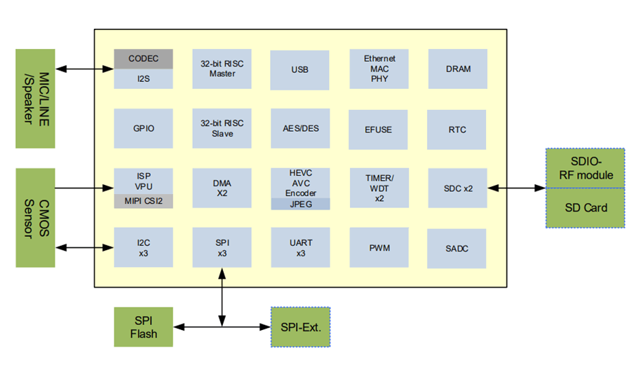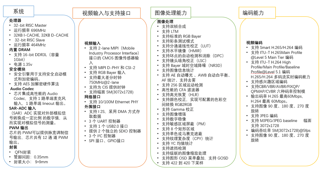 FH8856V200 是面向?qū)I(yè)型網(wǎng)絡(luò)攝像機應(yīng)用的高性能 H.265/H.264/JPEG SoC 芯片,幅面支持 5M(3072×1728)。芯片集成了高性能的 ISP 圖像處理模塊和視頻壓縮編碼器,具備優(yōu)異的圖像處理能力、極高的編碼質(zhì)量和極低的編碼碼率,同時內(nèi)部集成了 1Gb DDR3L 存儲器,擁有完備的應(yīng)用所需外設(shè)接口,包括 USB,SDIO 和 Ethernet 等。