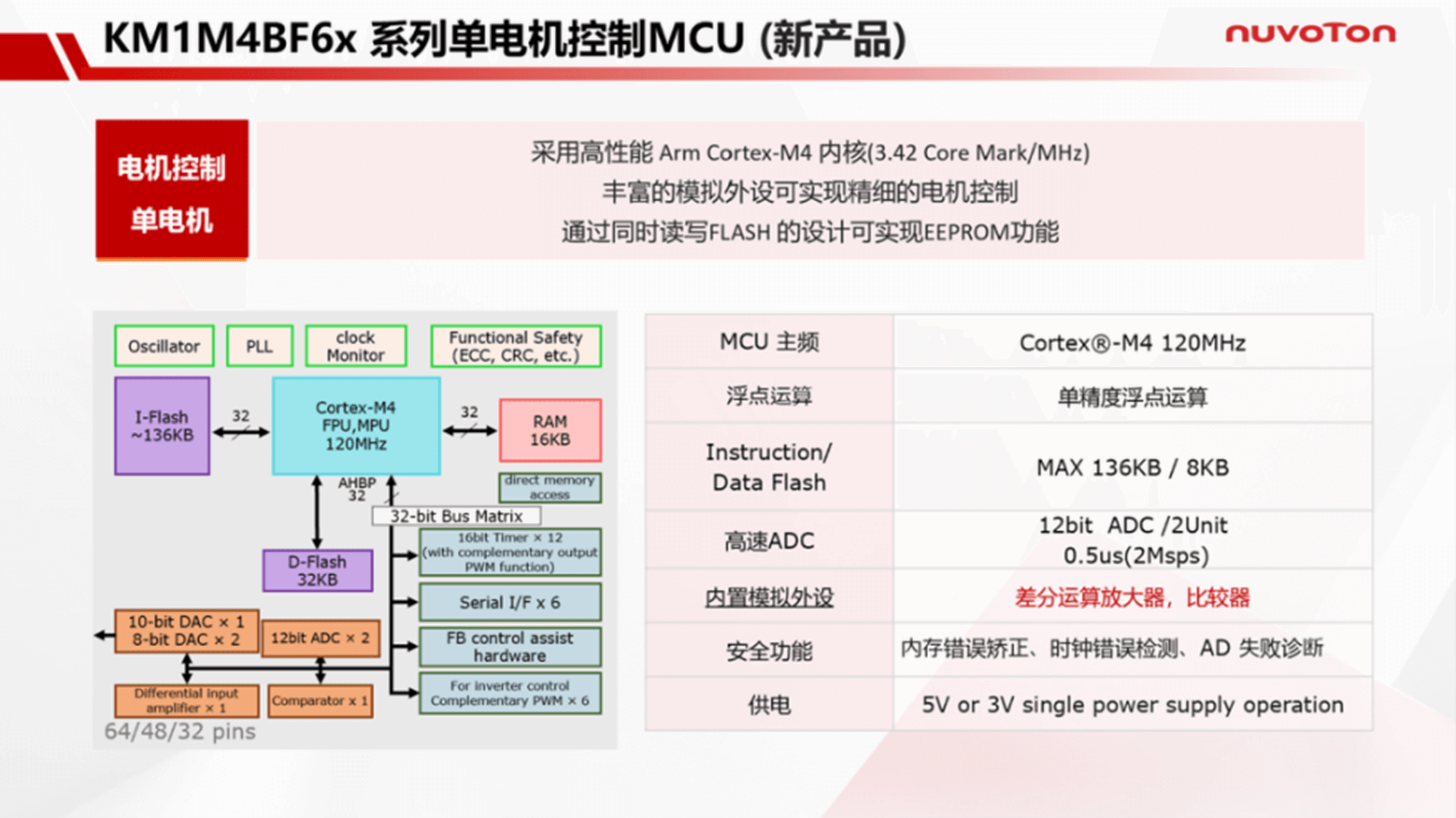 伴隨著電機(jī)控制技術(shù)和方案的不斷發(fā)展,作為整個(gè)控制的核心 MCU 也邁向了新的高度。為了滿足市場不同的應(yīng)用對高能效、高精度、高可靠性的電機(jī)控制和解決方案的迫切需求,新唐科技推出全新一代單電機(jī)控制的 MCU KM1M4BF6x 系列產(chǎn)品。