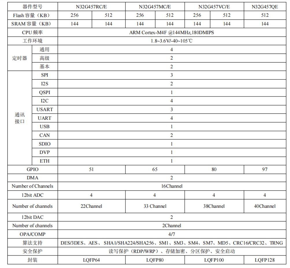 N32G457 系列采用 32 bit ARM Cortex-M4 內(nèi)核,最高工作主頻 144MHz,支持浮點(diǎn)運(yùn)算和 DSP 指令,集成多達(dá) 512KB Flash,144KB SRAM,內(nèi)置 4 個(gè) 12bit 5Msps ADC,4 路獨(dú)立軌到軌運(yùn)算放大器,7 個(gè)高速比較器,2 個(gè) 1Msps 12bit DAC,具體主要資源如下: