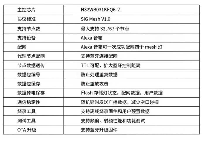 基于N32WB031系列實(shí)現(xiàn)的Mesh燈控方案具有如下功能特性: