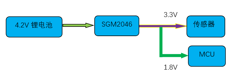 在智能手表項目中,客戶需要一顆超小型的LDO芯片,要求超低功耗,并且最好是一顆國產(chǎn)的,客戶供電部分采用了鋰離子電池供電,電池電壓4.2V,給客戶推薦了一顆圣邦微的SGM2046系列的LDO做降壓,降壓至3.3V給外部傳感器供電,工作時的電流需求500mA以上,另外一顆降壓至1.8V給MCU供電,電流要求100mA以內(nèi)。SGM2046是一款超小型封裝的LDO,尺寸只有0.8mm*1.2mm,非常適合小型化產(chǎn)品的應用,并且SGM2046系列待機功耗非常低,小于1μA,又有超高電源抑制比,因此可更長時間使用于小型化低功耗設(shè)備。