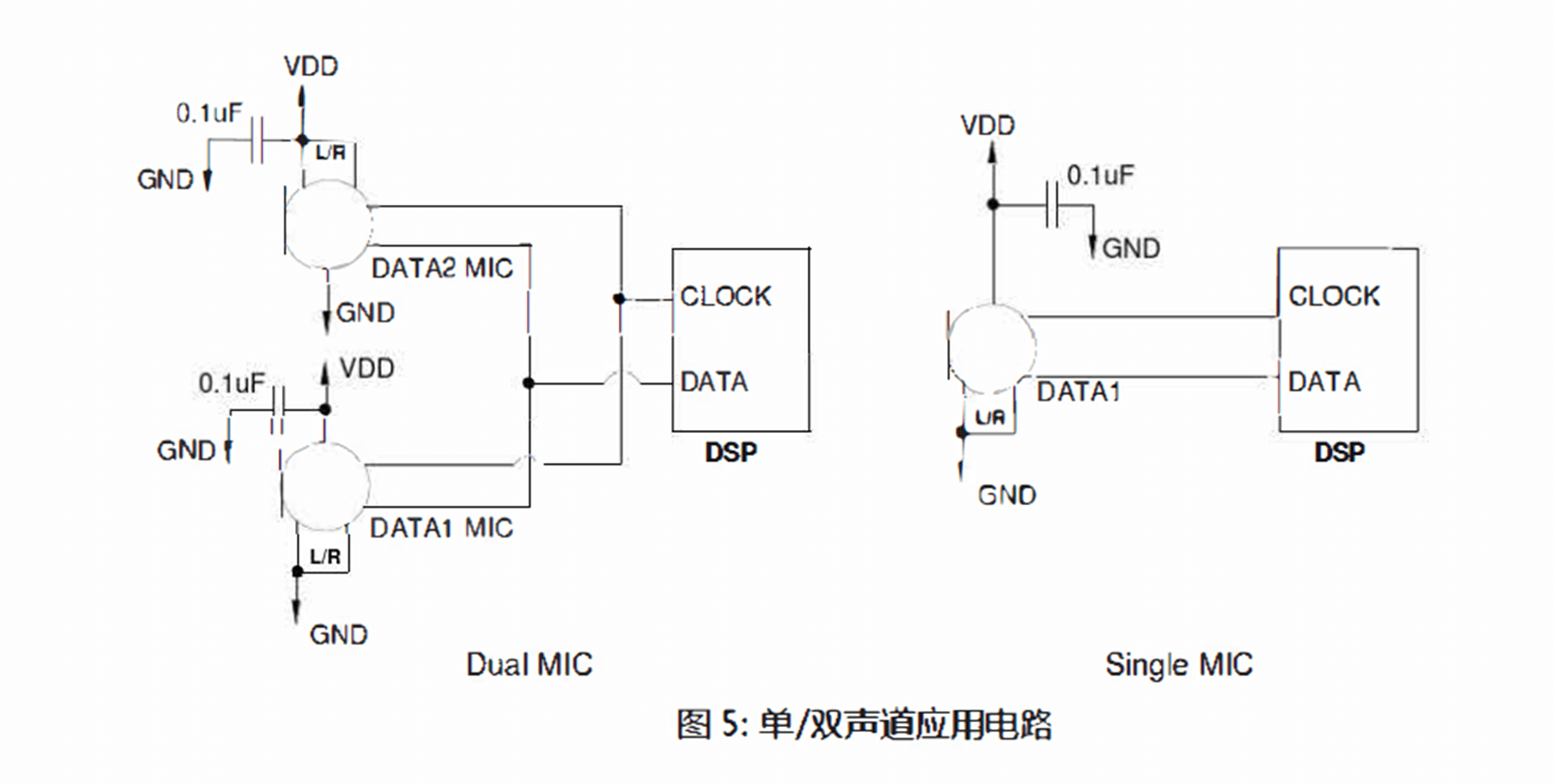 客戶可通過對(duì)L/R引腳的設(shè)置實(shí)現(xiàn)MEMS MIC單聲避或者雙聲道的使用 , 一般情況下 , 單MIC使用時(shí) ,建議客戶將 L/R引腳接地 , 避免電涌噪聲的影響;雙MIC使用時(shí) , 可將兩個(gè)MIC的輸出并聯(lián)走一條輸出線,下面給出單MIC和雙MIC的使用連接圖: