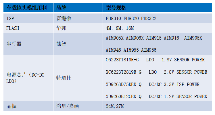 當(dāng)車載攝像頭開始工作時(shí),光線將透過鏡頭,經(jīng)過圖像傳感器將光信號(hào)轉(zhuǎn)化成電信號(hào),然后經(jīng)過A/D(模數(shù)轉(zhuǎn)換器)后變?yōu)閿?shù)字圖像信號(hào),再由ISP(圖像信號(hào)處理器)進(jìn)行色彩校正、降噪等一系列加工后,經(jīng)由串行器等將處理后的圖像數(shù)據(jù)傳輸給中央處理器。連接器主要用于固定攝像頭。