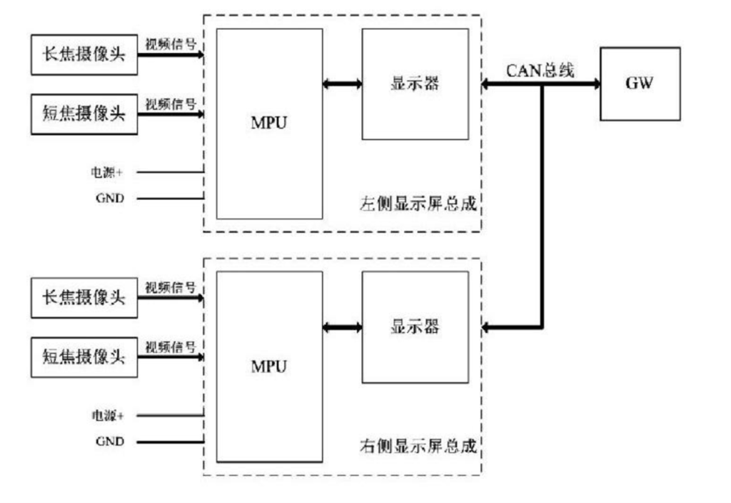 為滿足GB 15084中的視野要求,電子后視鏡可采用長焦攝像頭和短焦攝像頭相結(jié)合的方案,車輛近端和遠(yuǎn)端的環(huán)境畫面均能清晰的呈現(xiàn)在顯示屏上。