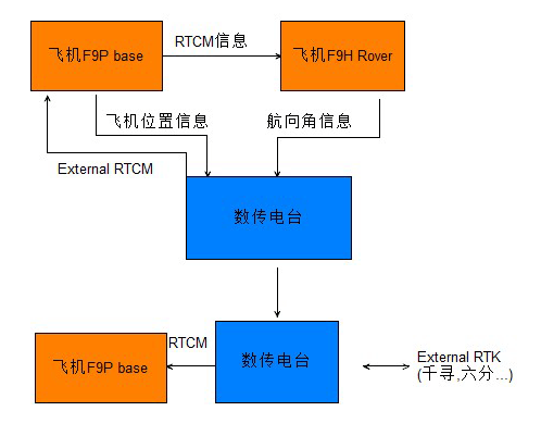 工作原理以及信號流程:飛機上的F9P base接入RTK信號,與飛機上F9H(rover)構(gòu)成moving-base系統(tǒng),可以知道飛機的精確位置和航向角。但是有一個要求是base和rover的安裝距離需要大于30cm;數(shù)傳電臺需要把F9P base和F9H的2個串口信號合并到一起,傳回汽車端,這里面包含飛機位置信息,航向角信息以及RTCM信息;汽車上安裝F9P,接收數(shù)傳電臺的RTCM信號,這樣構(gòu)成一個單RTK系統(tǒng),可以實時知道汽車和飛機的位置信息。