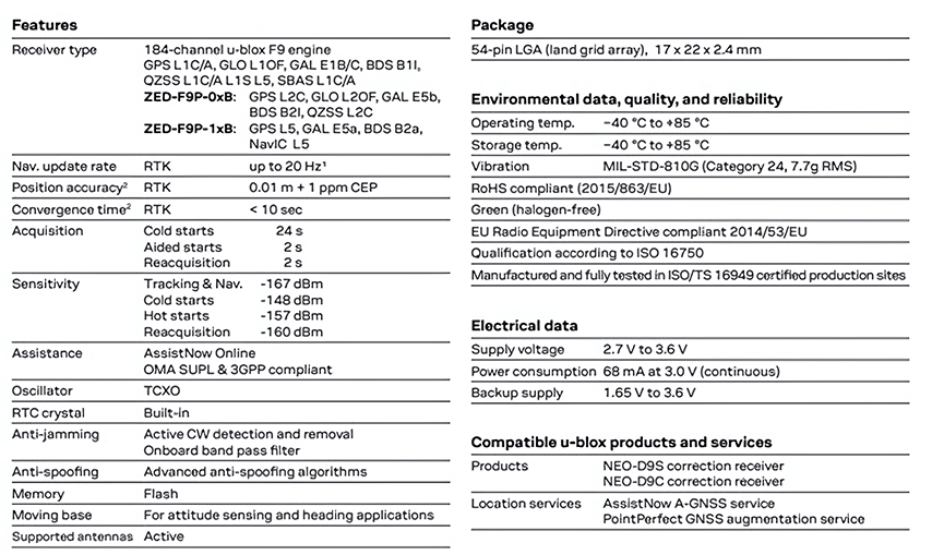 特點:ublox公司作為全球領(lǐng)先的定位與無線通信技術(shù)供應(yīng)商,結(jié)合自身綜合實力與采用最新推出的u-blox F9平臺的技術(shù),核心創(chuàng)新研發(fā)出可在數(shù)秒內(nèi)提供穩(wěn)定的高精度定位產(chǎn)品ZED-F9P。