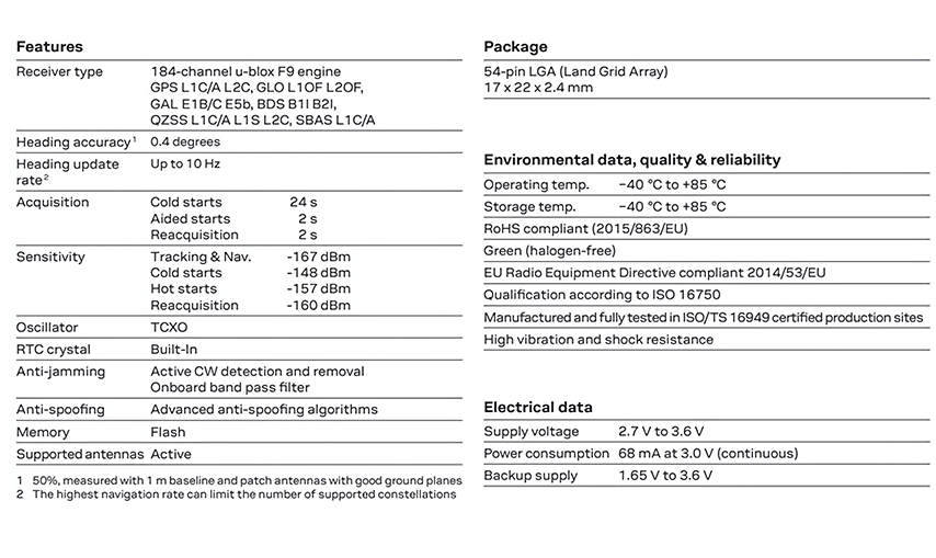 ZED-F9H作為附帶模塊,要求在同一設(shè)備上安裝ZED-F9P模塊。在該裝置中,ZED-F9P提供精確的GNSS位置,同時作為ZED-F9H模塊的移動基座,ZED-F9H模塊輸出精確的姿態(tài)信息。由于航向信息是基于全球?qū)Ш叫l(wèi)星系統(tǒng)的,因此不需要預(yù)先校準,從而確保易于生產(chǎn)、集成和操作。精確的航向信息總是可用的,即使在靜止的情況下。ZED-F9H設(shè)計用于降低標題應(yīng)用程序的系統(tǒng)成本,并具有最小的電子BOM。由于其體積小,重量輕,功耗低,非常適合大眾市場的采用。